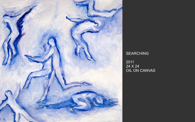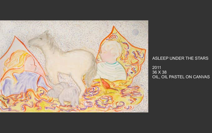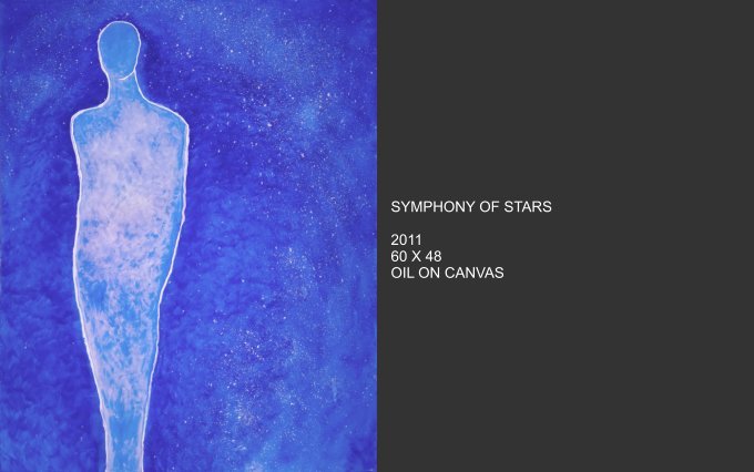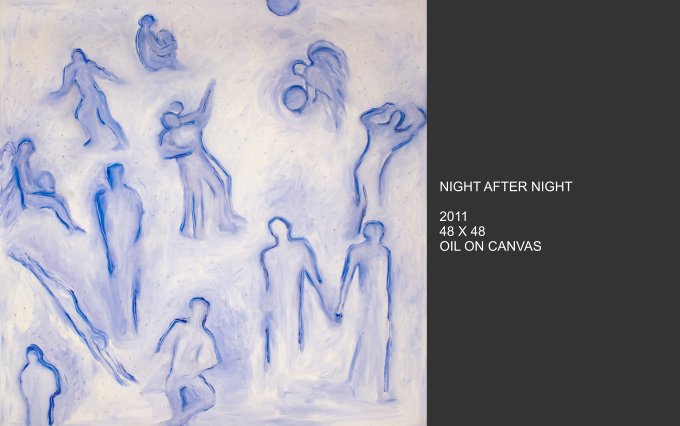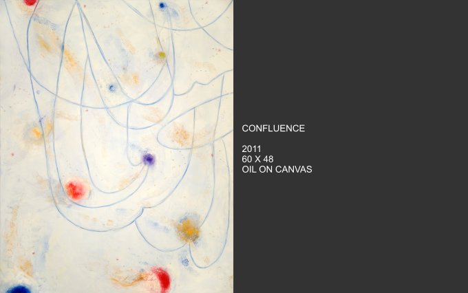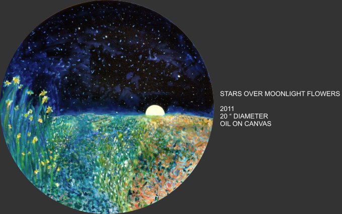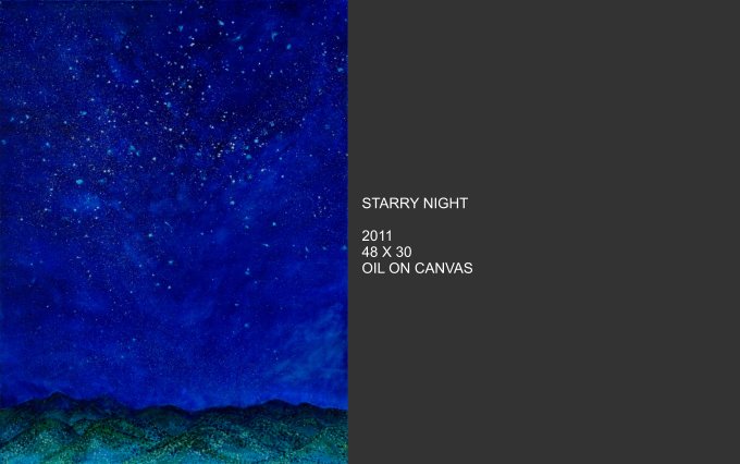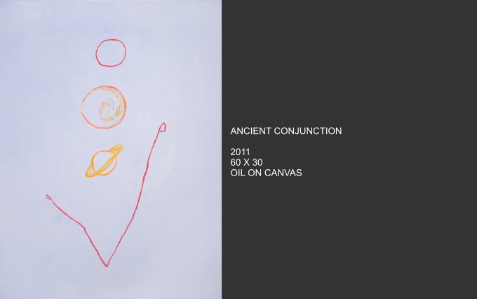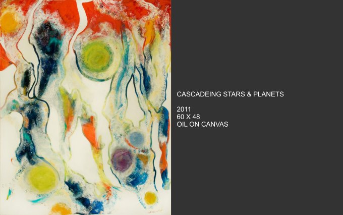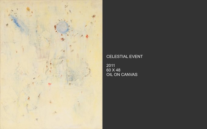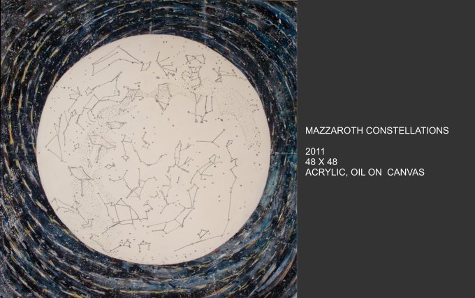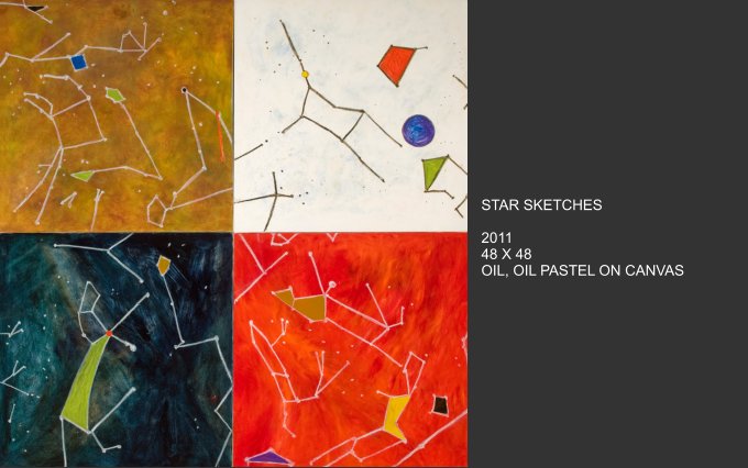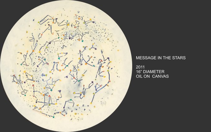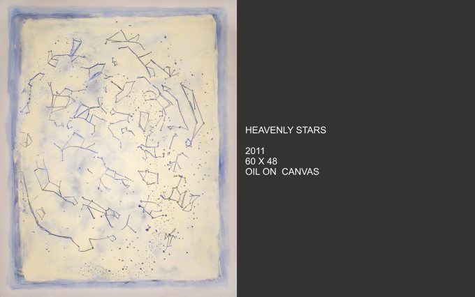 Celestial Phenomena explores what emerges from the tranquil night and captures the cosmos that blankets us from above. Moody constellations, celestial shapes and spatial shades come alive on canvas with vivid and muted colors. Using linear elements and speckles and spots of bright color, the images are astronomical maps with a sometimes figurative quality.